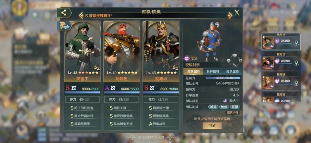主将是萨拉丁自带高连击,能多次触发高卢野蛮冲锋和翼骑兵进军两个高额伤害的突击技能;副将腓特烈带乌尔班射石炮为主将加力量,大幅提高其输出;爱德华则搭配楔型骑兵阵和野蛮战吼进一步加强主将输出。