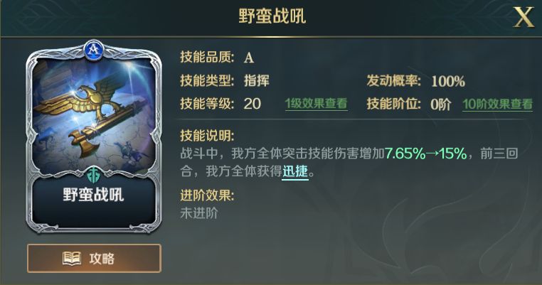 野蛮战吼野蛮战吼则是高性价比的突击队神技了,前三回合突击技能伤害增加,且全体获得迅捷状态。此技能可补充全队输出,提供的迅捷效果则能帮助我方队伍在争夺先手权上占得优势。