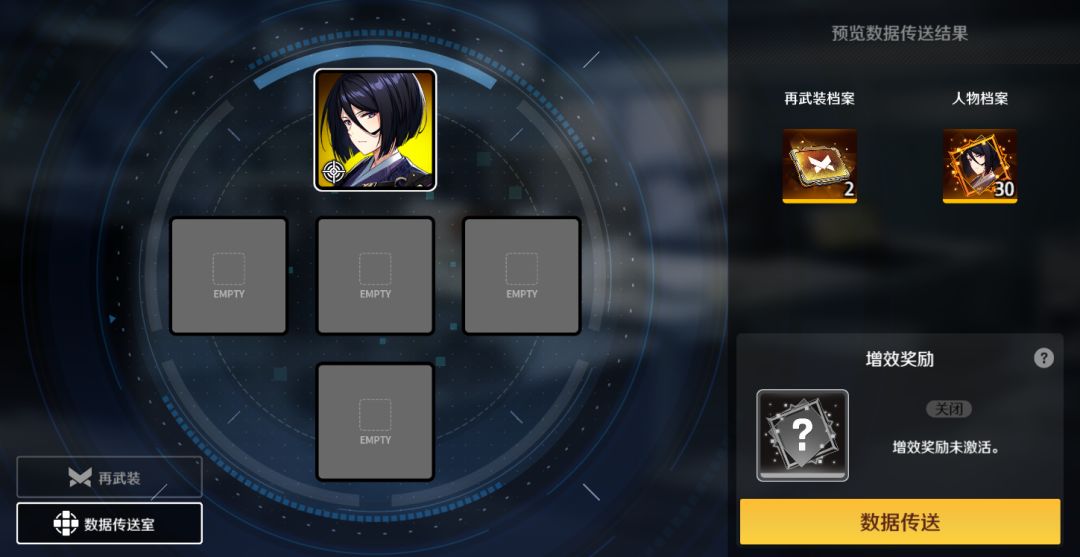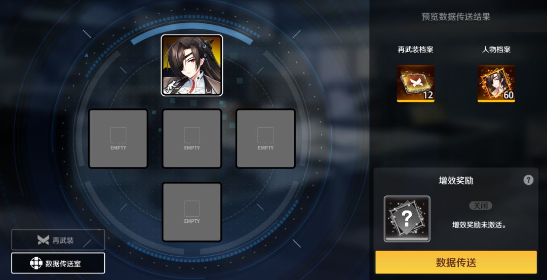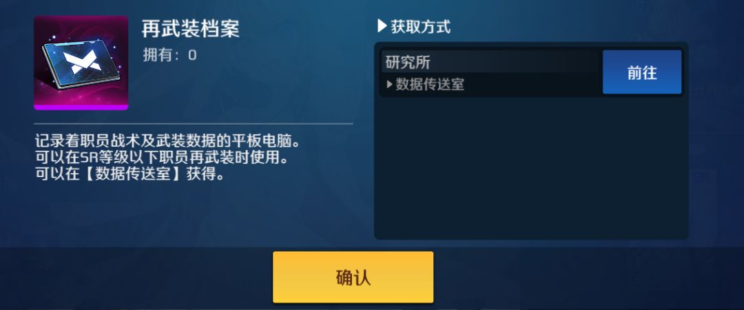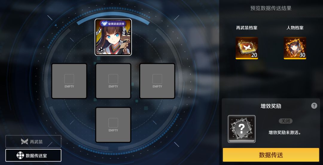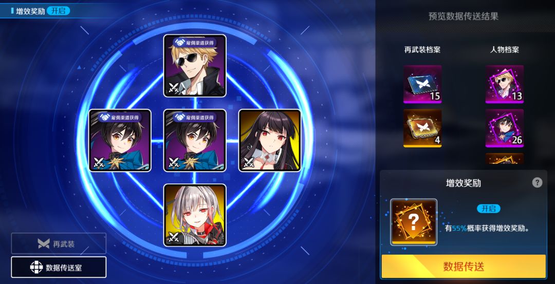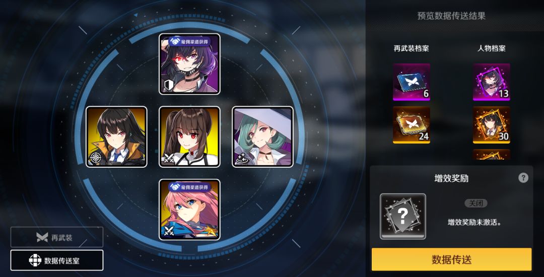 老板可通过“数据传送室”(再武装操作界面左下角按钮),消耗已有角色(SR及以上),将其转换为“再武装档案”。消耗1个SR单位可得到5份“再武装档案(蓝色)”以及13份对应的人物档案。