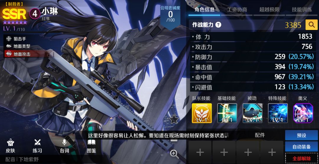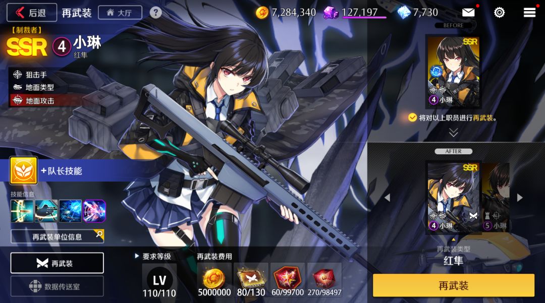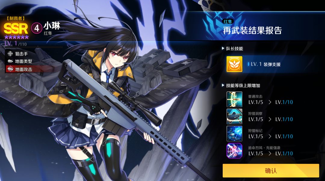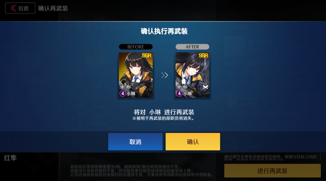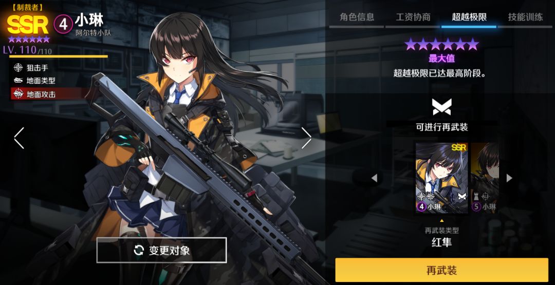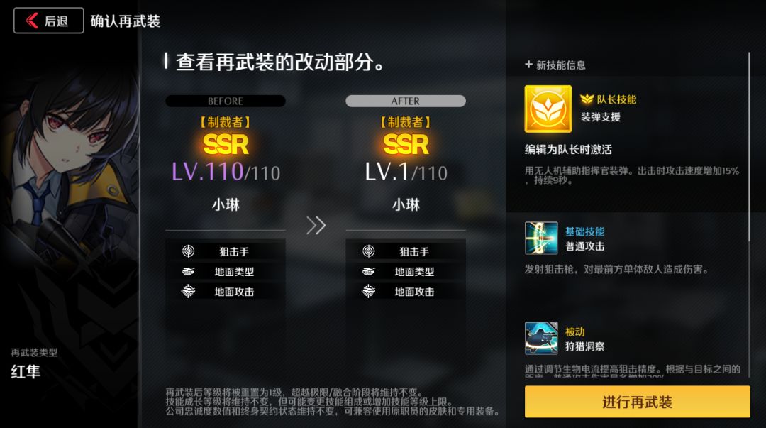 完成再武装后,该单位将根据成长路径获得新的基础属性值以及人物技能,届时人物技能将增加“队长技”。进行再武装的单位可能会根据老板的养成选择改变其职业(比如狙击手单位小琳和塔单位小琳)。
