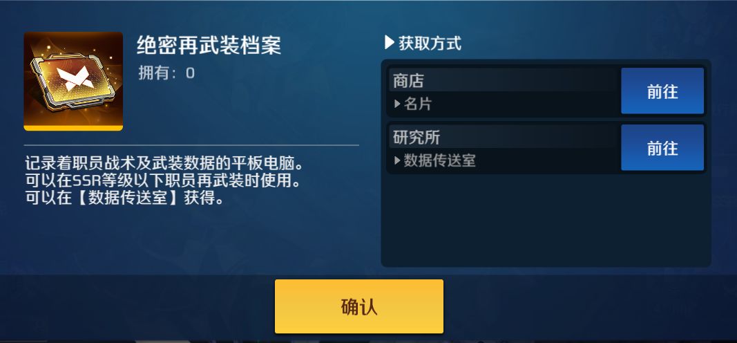 “再武装档案(蓝色)”为SR、R单位再武装使用,“绝密再武装档案(金色)”为SSR单位再武装使用。