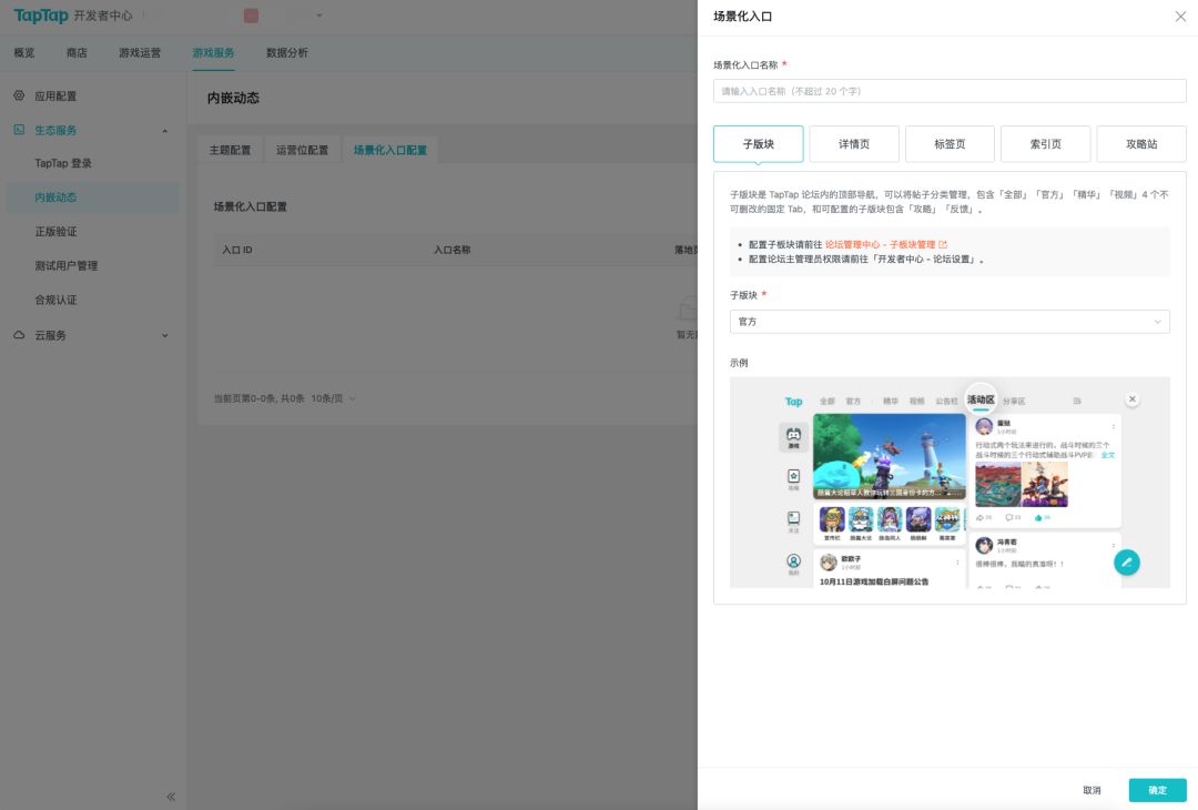 场景化入口可以在 DC 后台「游戏服务」-「内嵌动态」-「场景化入口配置」中创建,提交入口名称、落地页类型、落地页后,生成的「入口 ID」 可以在游戏内使用。