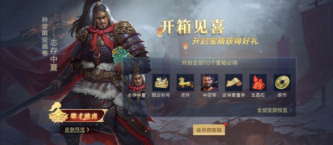 画卷中的孙坚将军身披战甲,提刃攥玺破军而来。如此气势十足的大将皮肤,主公们还不快快为孙将军领回家!