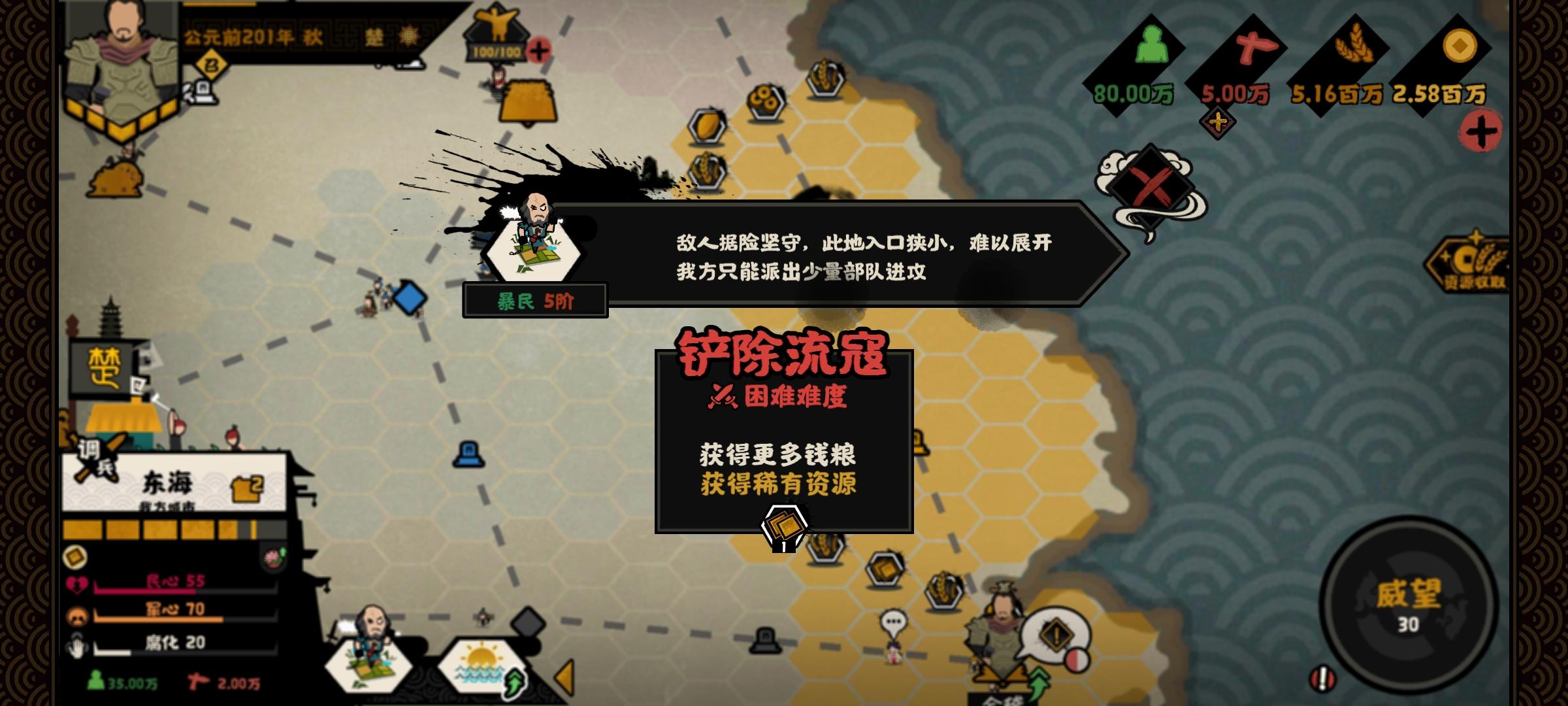 那么我们应该如何处理流寇呢? 并不是说越早消灭流寇越好,尽管消灭他们以后我们可以获得一个能够产生资源的据点 。但是当我们财政出现赤字的时候,我们也可以把它留下来。