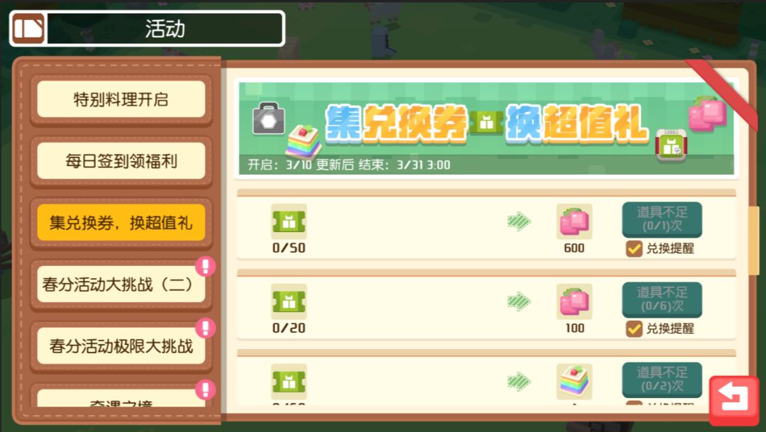 3月31日-4月21日,玩家参与活动,可以获得火山溶洞兑换券,兑换券可以在兑换活动中兑换新料理素材、彩虹松糕等道具。