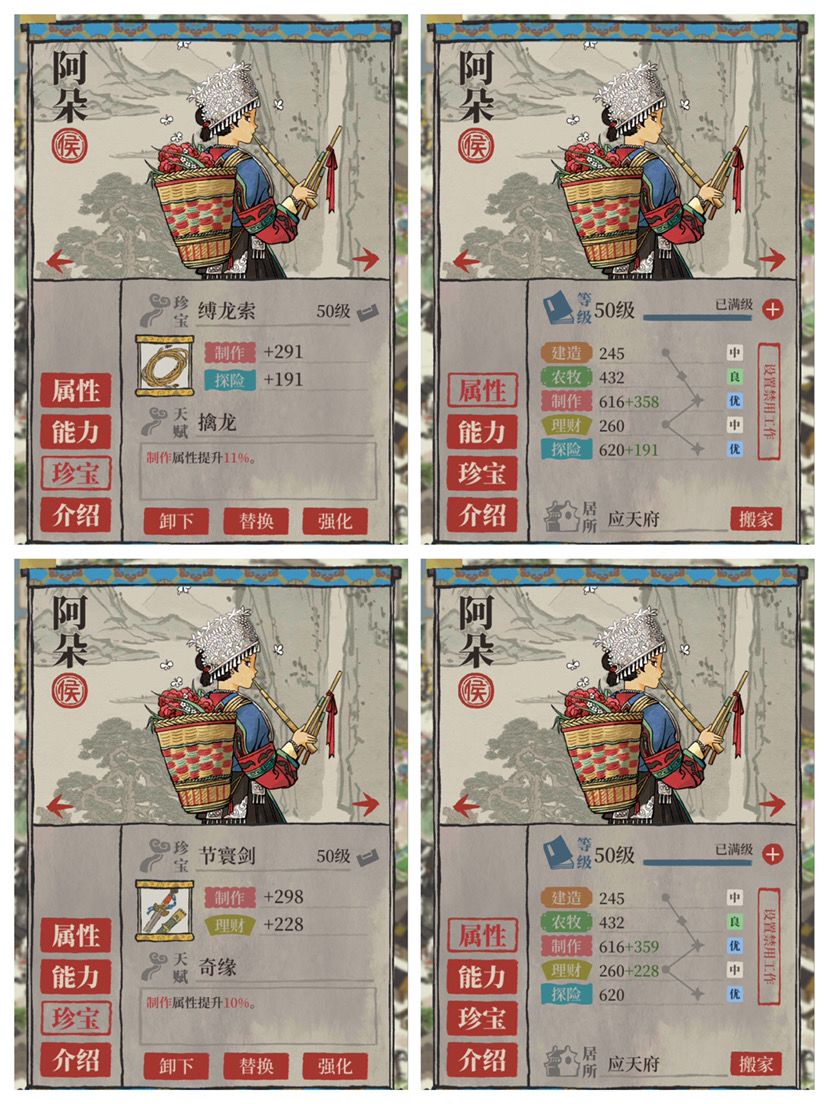 农牧这里说明一下为什么不选择农牧数值最高的江南春图,因为江南春图的天赋属性是建造,农牧没有10%的比例加成,只有数值加成,因此选择了天赋属性是农牧的且数值最高的冰玉棋盘。
