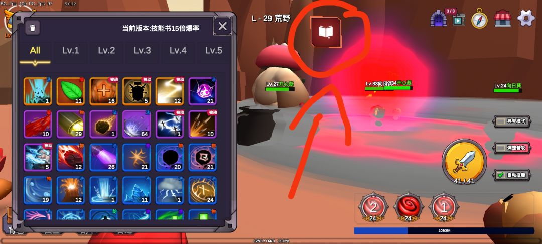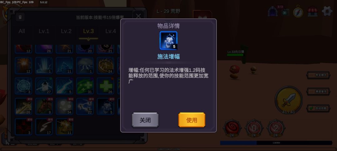 选取多技能位宠物带上上述技能,开启自动放技能进入背包旁边的技能测试界面加入大量怪物