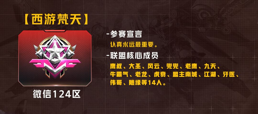 来自微信124区,从创建至今经历了三次合区,其前身为巅峰联赛S4冠军【梵音天】。在第三次合区中,【梵音天】与【西游记】联盟达成共识,共同组成新的联盟【西游梵天】。自此两方成员就此成为战友,团结进取,上下一心。