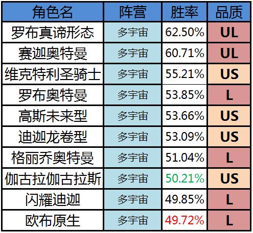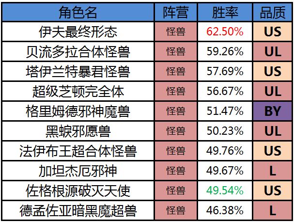 (胜率上升最大的角色用了红色字体表示,胜率下降最大的角色用了绿色字体表示)