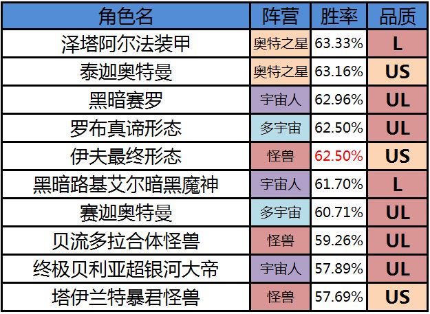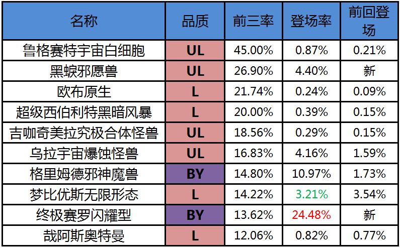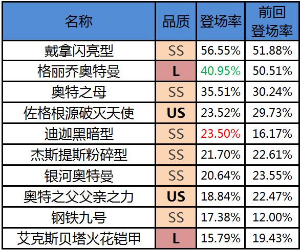 经过以上数据,我们可以发现,深受玩家欢迎的光辉赛罗登场率大幅度上升,邪愿兽黑蜧在本次比赛中也有不错的表现,我们后续会继续优化游戏环境,给小伙伴们更好的体验!