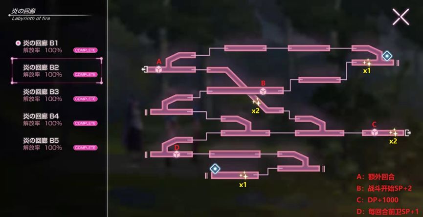 1. 以我的阵容为例,开始先去B1右上角下来拿后卫SP+2,然后到B2跑点路去拿额外回合。B2那段路有点距离,运气好碰一次敌就行了,运气差碰两次。但拿到之后就好很多。不仅多一个回合,关键多2点SP,就算攒技能也快很多