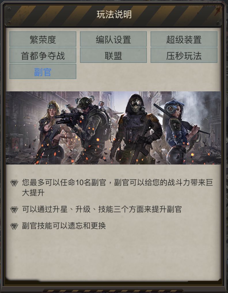 进入“主城”界面旁的“政务中心”可以查看日常任务,日常任务中的每个活跃阶段都会奖励角色经验以及加速各类道具,满活跃的奖励会有2个副官高级招募令的碎片,必须要每天完成,是获取副官招募以及角色经验的一个途径,以及有一些玩法的说明,可以帮大家快速理解游戏。