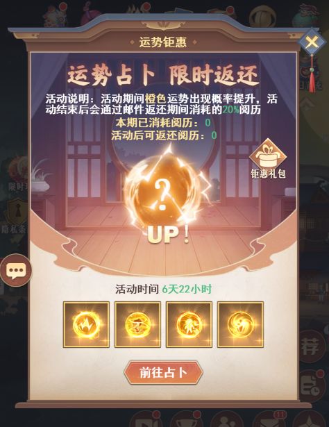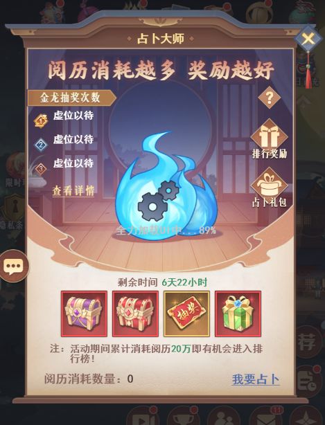 4.4月1日,开服>7天的区服开启活动【占卜大师】,活动期间消耗阅历达到指定数量即有机会上榜,活动结束后根据玩家参与情况发送排行奖和参与奖,详情请查看游戏内实际内容。