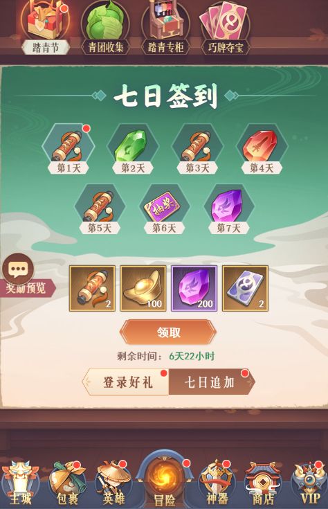 (1)踏青签到:活动期间累计登陆可领取奖励,更能付费购买追加超值礼包;