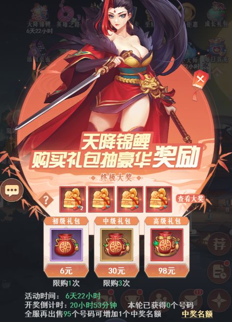 6.4月1日,开服>14天的区服开启活动【幸运锦鲤】,玩家购买礼包即可获得号码参与抽奖,持有号码越多中奖概率越大,每轮抽奖初始只有1个中奖名额,开奖前全服玩家每获得100个号码即可解锁1个中奖名额,最多可有6个中奖名额,详情请查看游戏内实际内容。