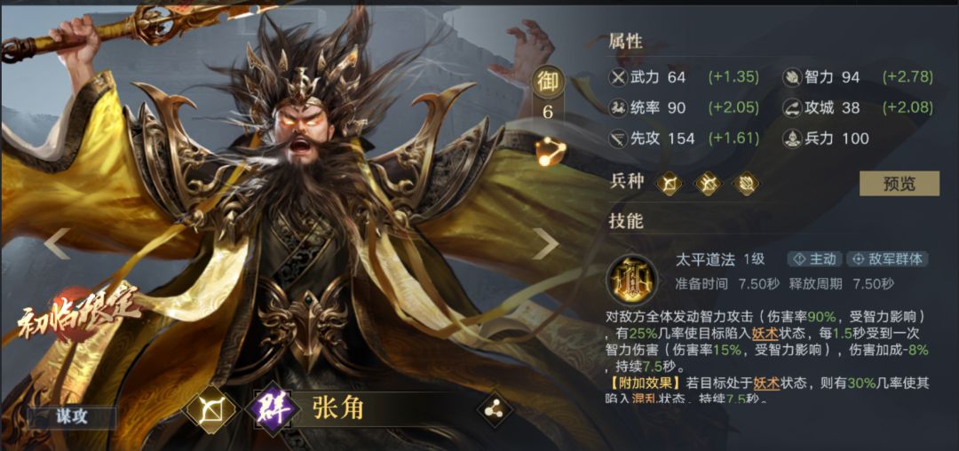 ①:张角是初临限定武将,并且还是为数不多的六御中的一个