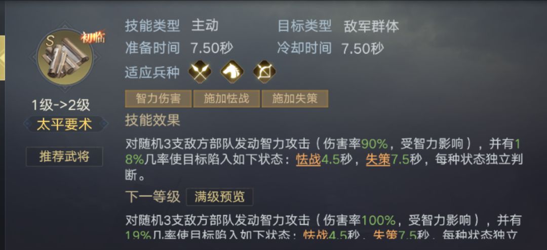 满级效果:对随机3支敌方部队发动智力攻击(伤害率180%,受智力影响),并有27%几率使目标陷入如下状态:怯战4.5秒,失策7.5秒,每种状态独立判断。