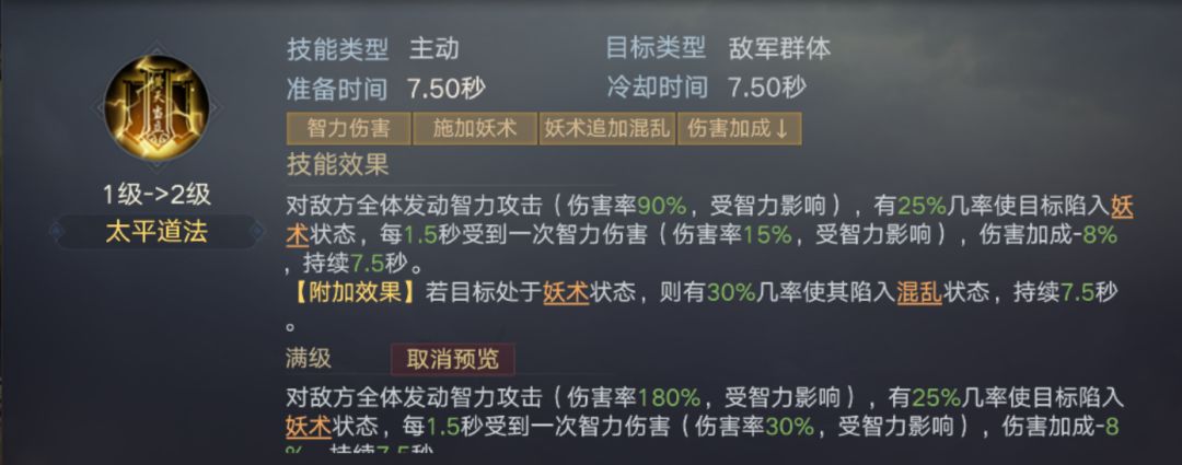 满级效果:对敌方全体发动智力攻击(伤害率180%,受智力影响),有25%几率使目标陷入妖术状态,每1.5秒受到一次智力伤害(伤害率30%,受智力影响),伤害加成-8%,持续7.5秒。