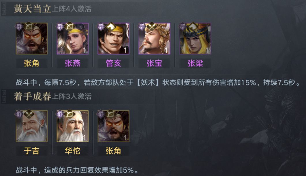 将缘②——黄天当立:在与张燕、管亥、张宝、张梁中任意三人一同上场激活,效果为:在战斗中,每隔7.5秒,若敌方部队处于【妖术】状态下则受到所有伤害增加15%,持续7.5秒。