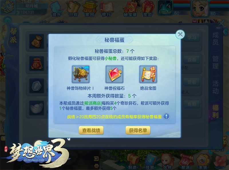 3)根据帮派规模的等级和帮派成员在帮派商店中购买[奇珍异石]的数量,帮派每周可获得一定数量的福蛋;