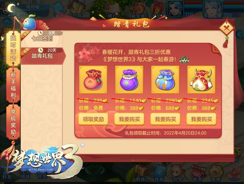 3月31日-4月20日24:00期间可前往奖励界面领取和购买踏青礼包。