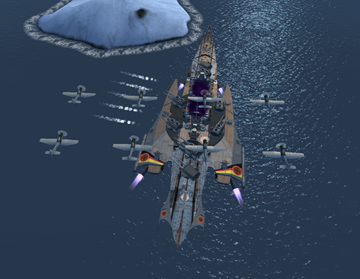 一艘巨大的冰航母,携带三组鱼雷机,三组兰卡斯特四发重型轰炸机,其投下的航弹若是命中会造成相当大伤害