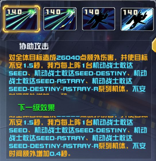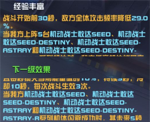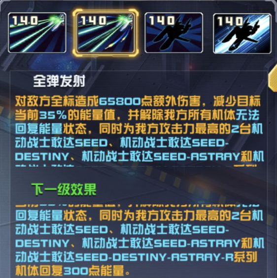 当我方上阵5台机动战士敢达SEED、机动战士敢达SEED-DESTINY、机动战士敢达SEED-ASTRAY、机动战士敢达SEED-ASTRAY-R系列机体时,我方任意机体能量高于350会使敌方全体武器损坏(无法行动,并且每秒损失当前能量值的10%),持续3秒,冷却10秒,每次战斗生效3次。