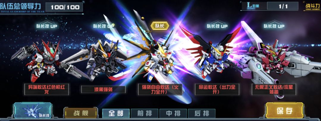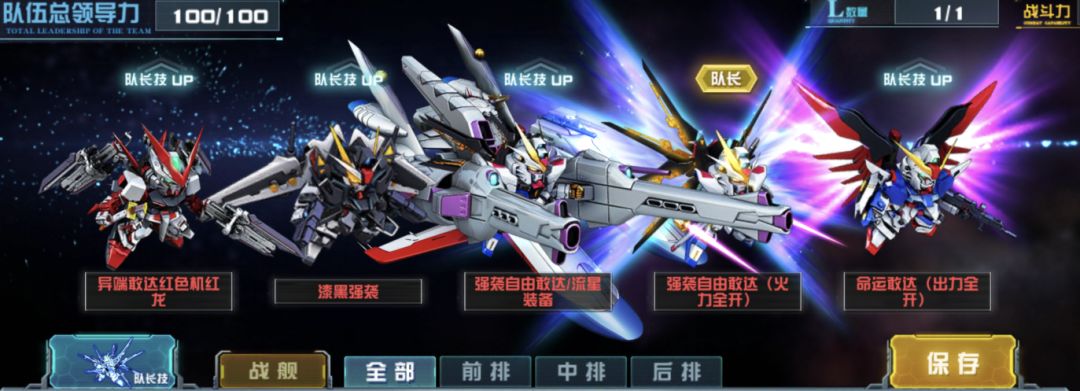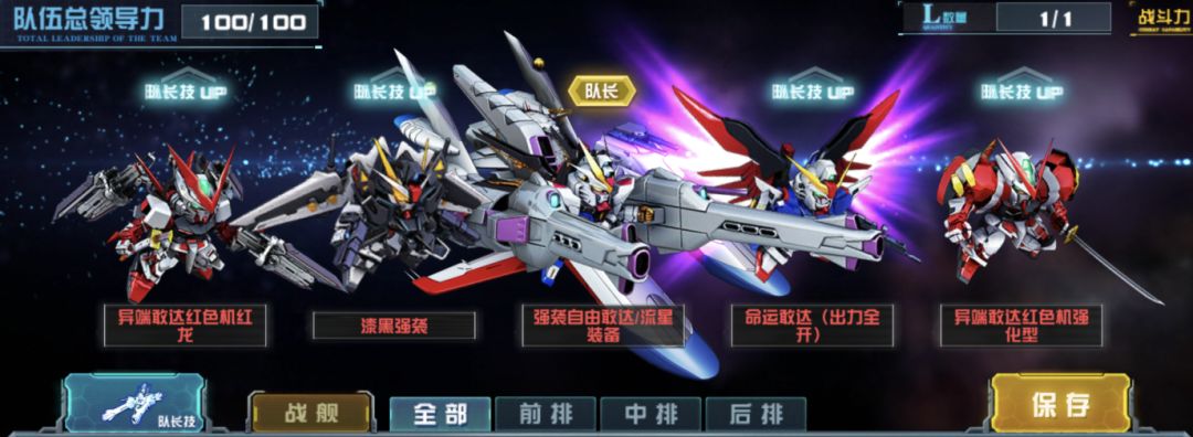 这是一种目前在SEED系列队伍中相对主流的搭配方式,典藏机强袭自由火力全开作为队长,再将强袭自由敢达流星装备从浮游队调回,同时漆黑强袭的高闪避能力可以很好的搭配大天使号(Destiny)的技能使用。