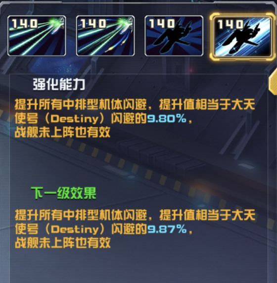提升所有中排机体闪避,提升值相当于大天使号(Destiny)闪避的9.80%,战舰未上阵也有效。