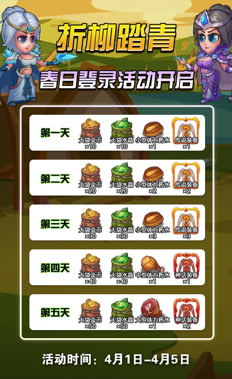 四月已至,春暖花开,小长假即将到来。《宝箱与勇士》的春日登录活动也正式开启啦!活动期间登录游戏即可领取丰富游戏资源。