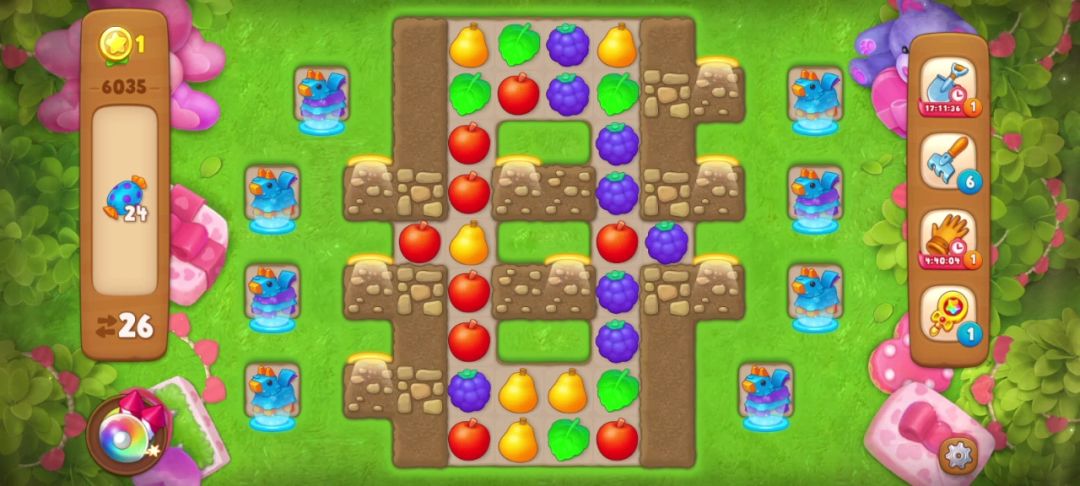 步数只剩4步但是运气来了还是没能过~红框里匹配葡萄可以制造一个炸/弹,得到下图