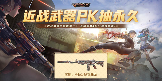 所以,你喜欢这个新登场的青花扇吗?你是更喜欢这种新颖的近战武器呢?还是偏爱传统的尼泊尔、斧头等传统手感的武器?具体参与方式如下:只需要在这里,分享你对这些近战武器的看法,即有机会将M4A1-秘银赤龙(永久)带回家!本次PK主题:近战武器大PK?红方:新颖武器,别样感觉我很爱!蓝方:传统武器,元老地位不可撼动!【本期奖励】