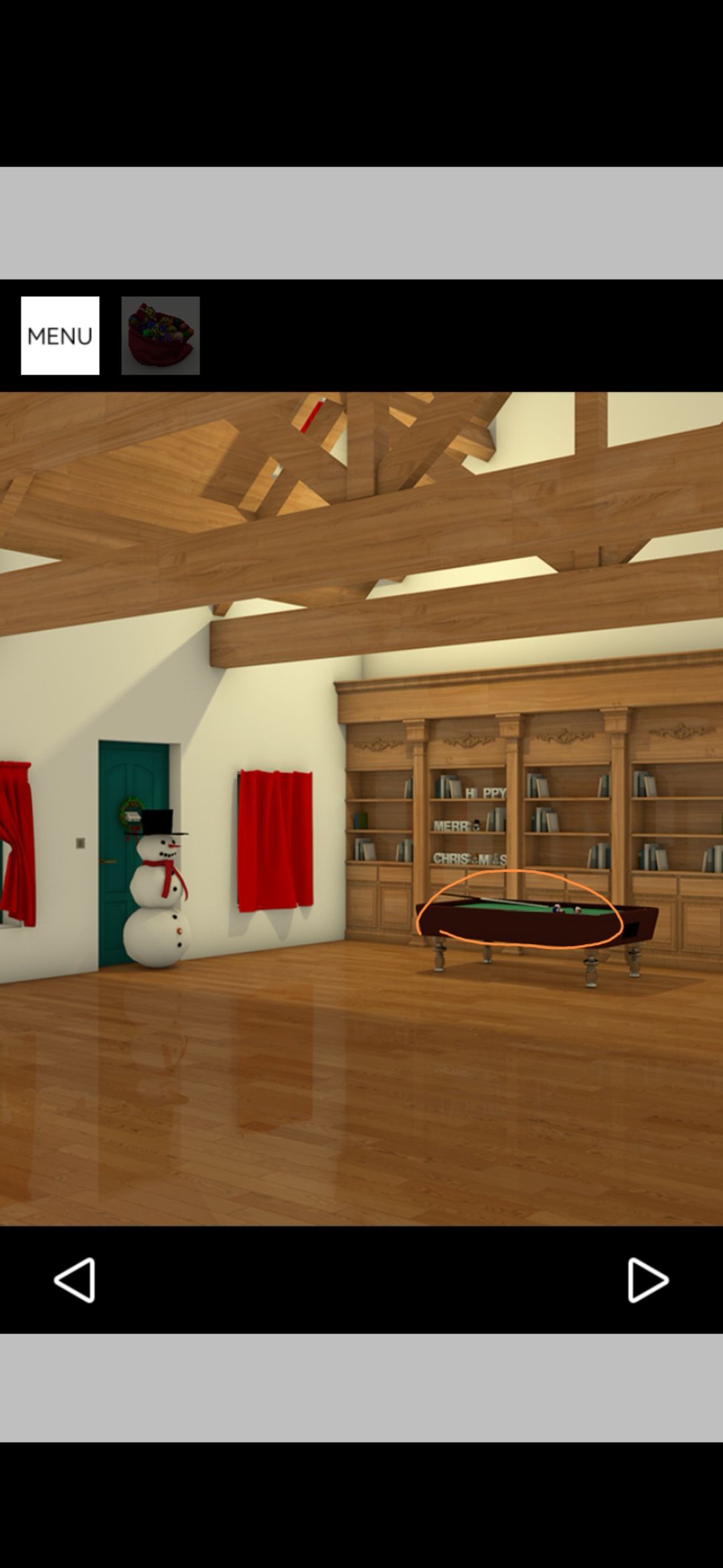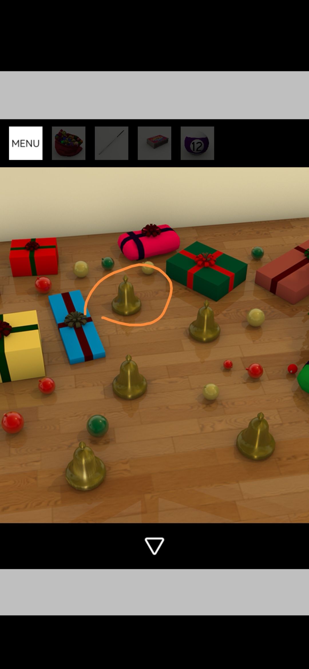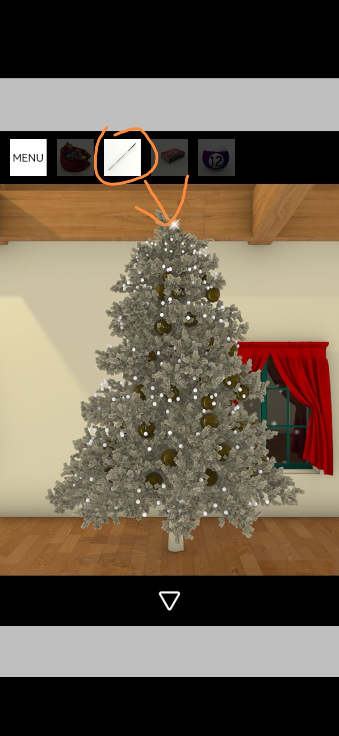 点击拾取图中装饰球盒,把球挂在圣诞树上,点击放大得到提示黄1,放大剩下的空盒得到火柴盒