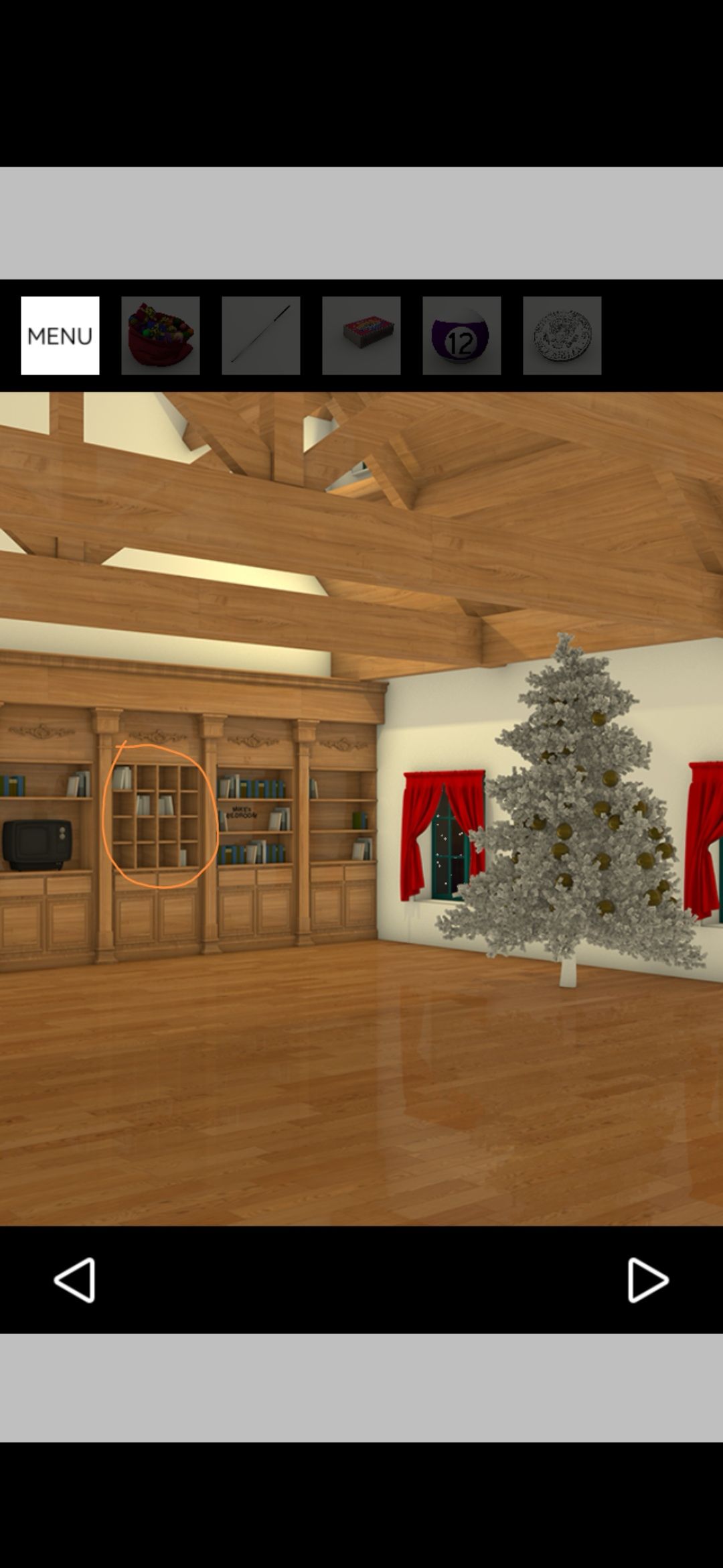 点击图中书架,把球按图中顺序放置打开密室的门,点击放大礼物堆得到礼物,点击桌面上的信件放上礼物得到火柴