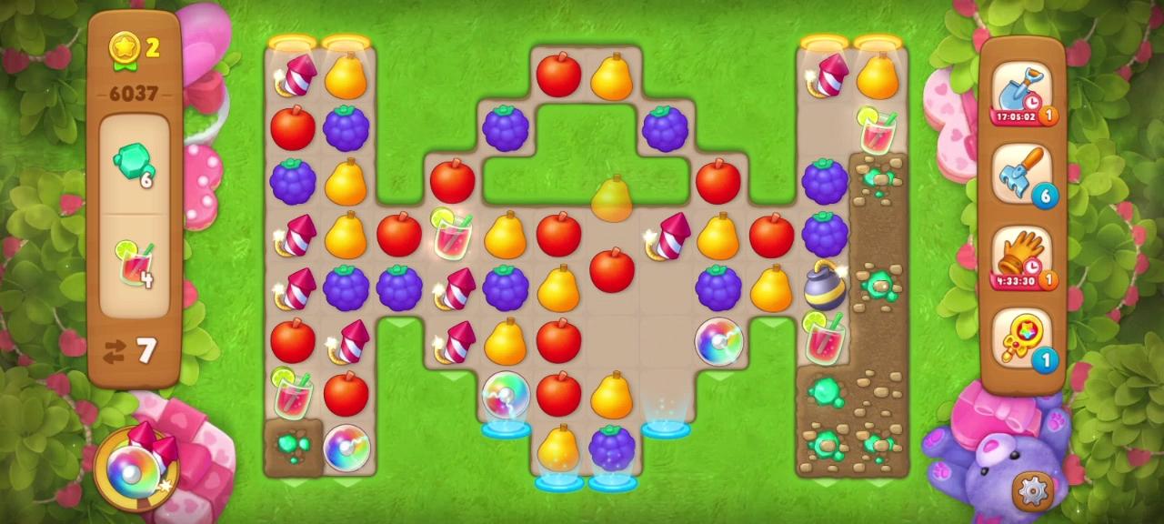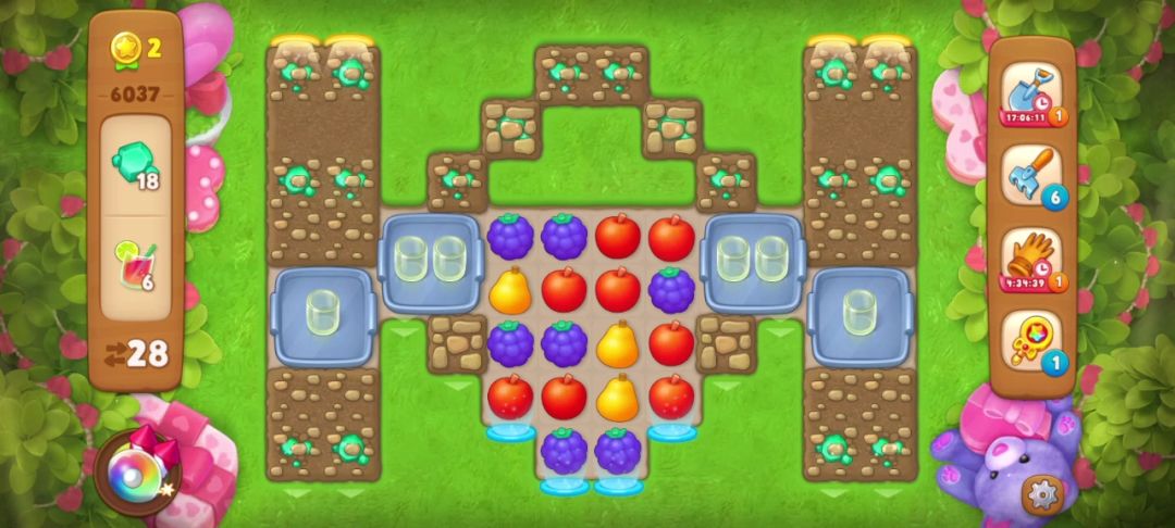 ①观察全局:本关的收集目标柠檬水需要在柠檬水托盘附近匹配才能得到,并且柠檬水托盘本身可以算是障碍物让元素无法掉落,所以本关的首要目标是清除柠檬水托盘释放出来所有柠檬水!