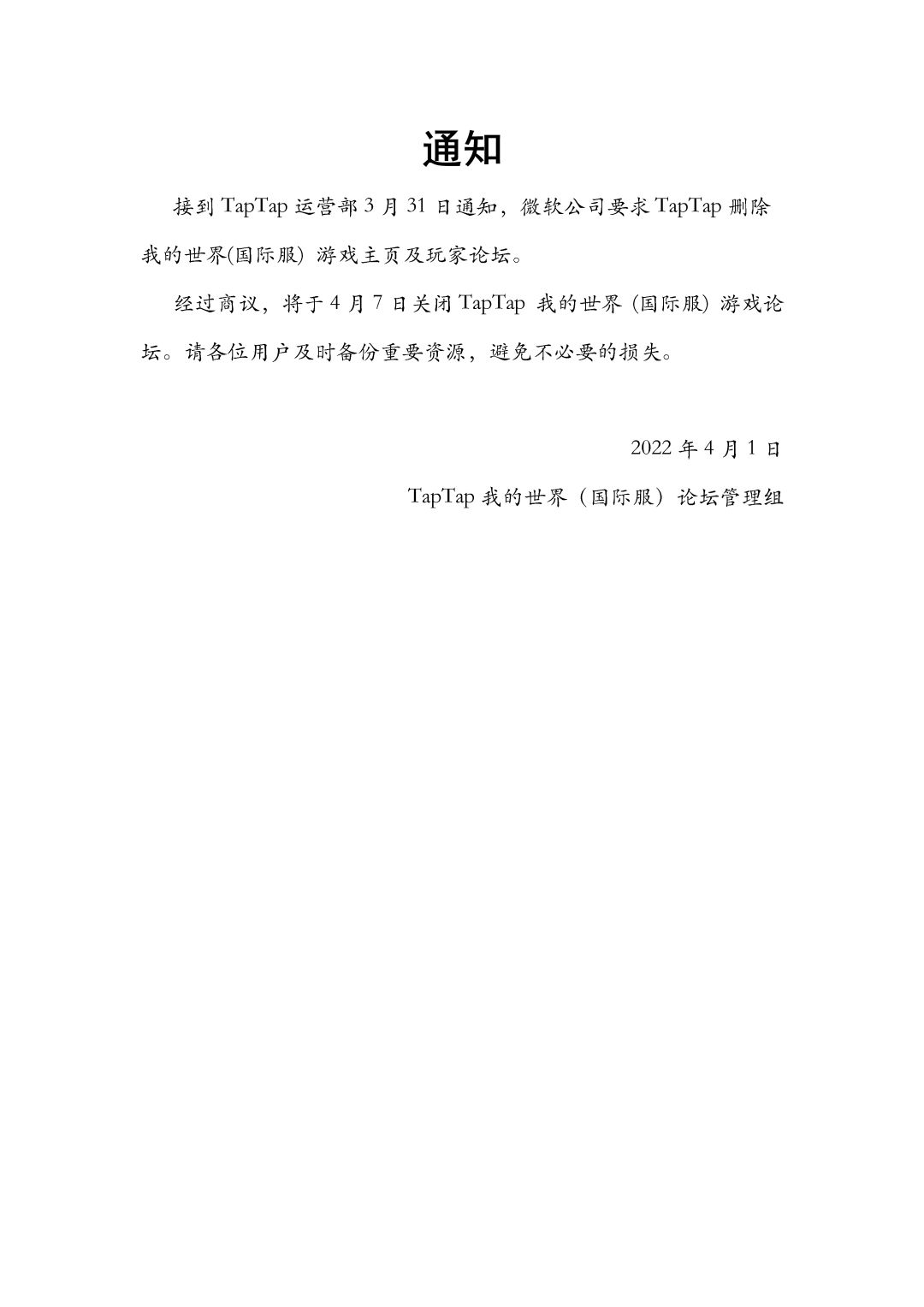 接到TapTap运营部3月30日通知,微软公司要求TapTap删除我的世界(国际服) 游戏主页及玩家论坛。