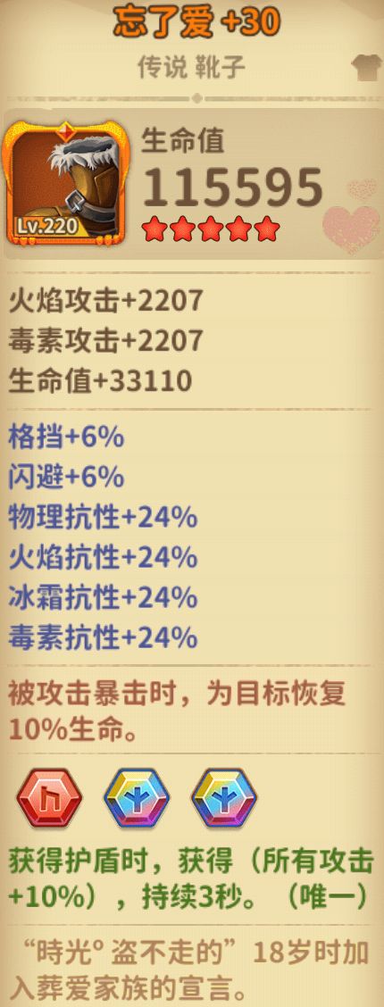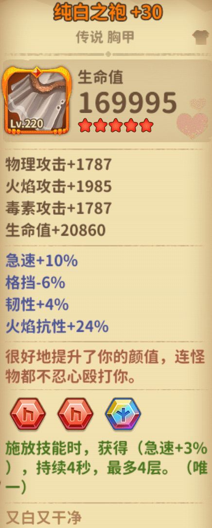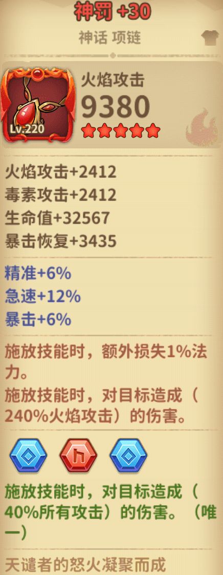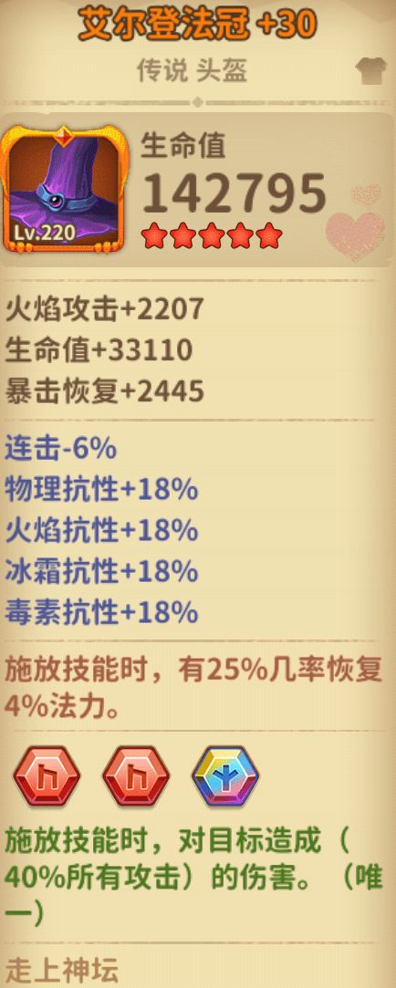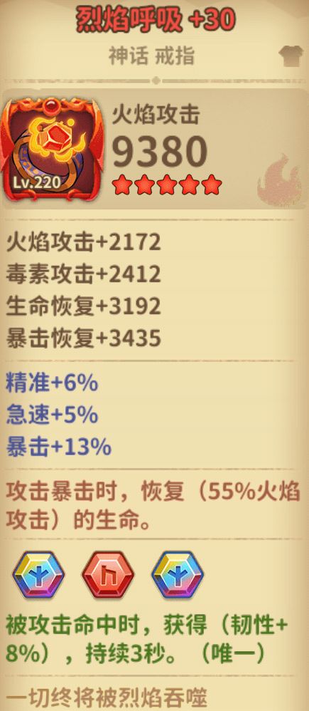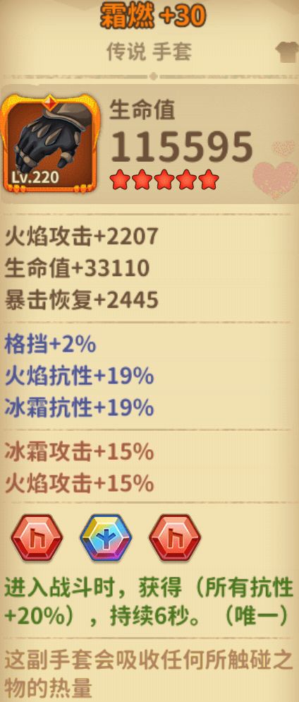 不管它是三词条、四词条,里面有火攻、生命、其它攻击、一条回复类(比如生命回复、暴击回复)这是比较理想的。