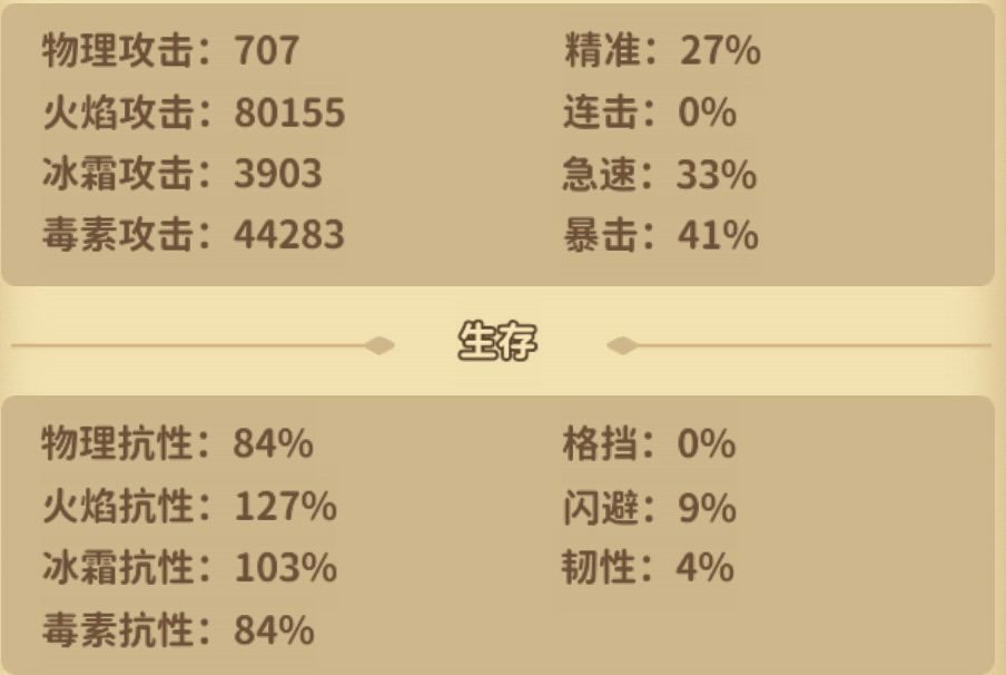 精准27、暴击率41,如果要用这个过地狱25,那就要插入大量的暴击率,因为满打满算暴击率是84点,符石孔一共24孔.插入16个暴击率么就离谱哈哈,在插入少量精准、少量韧性,这样的话输出就真的低了我感觉,花销大主要是“黑心老板”怎么舍得哦⊙∀⊙!