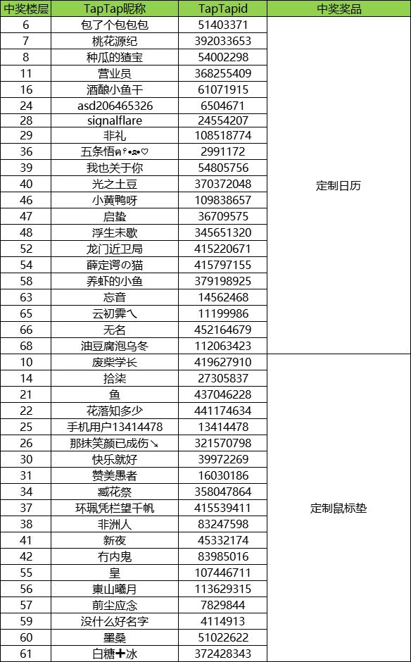 以下为本期活动中奖名单,辛苦大大们加下小助手QQ:321800254,提供中奖截图和TapTap个人页截图,联系发奖小助手领奖哦~(搜不到的可以先加QQ1023868788)