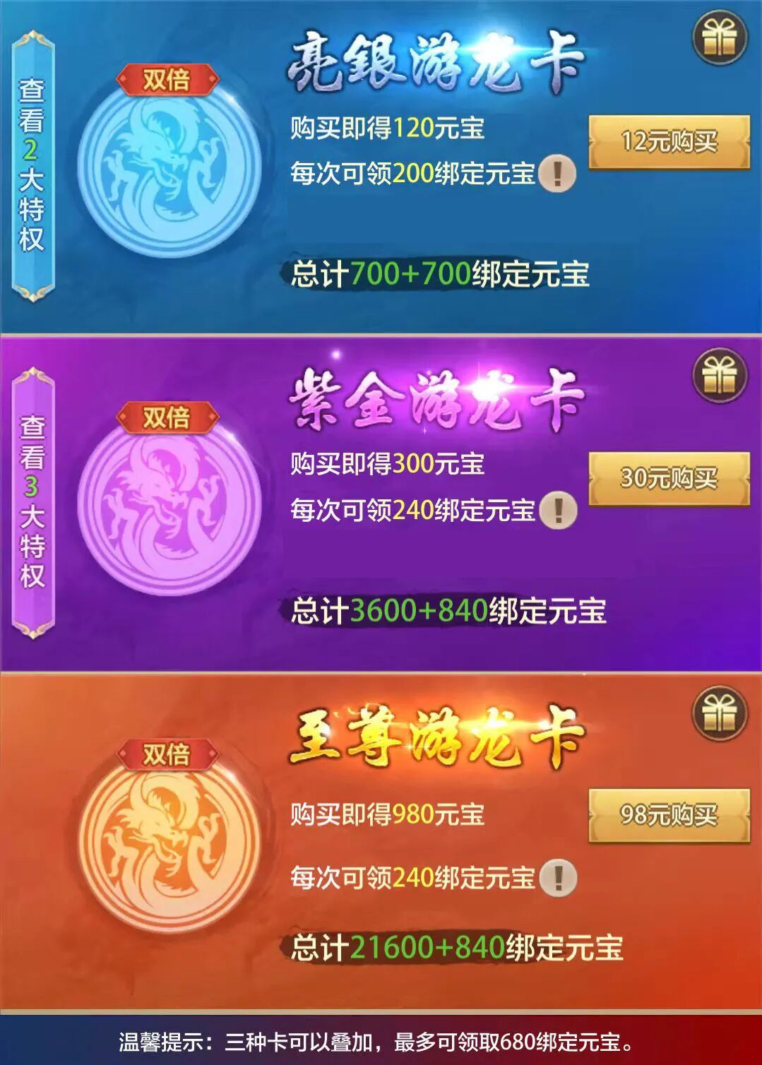活动期间,四种游龙卡每日领取绑元翻倍,活动期间显示的绑元数为翻倍后的数量。周年游龙卡仅有购买过的玩家可以领取,本次活动不开放周年卡购买