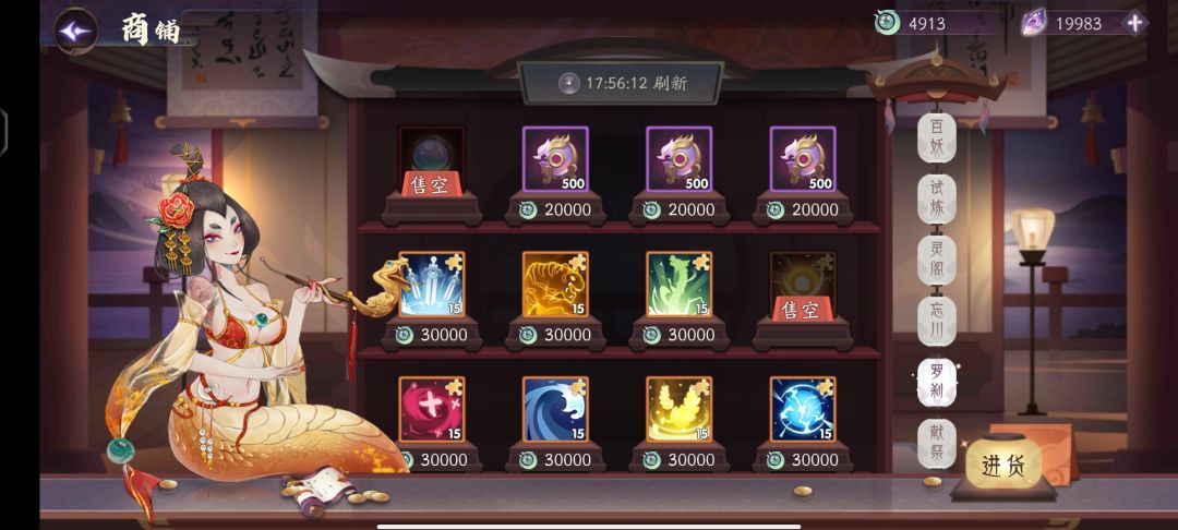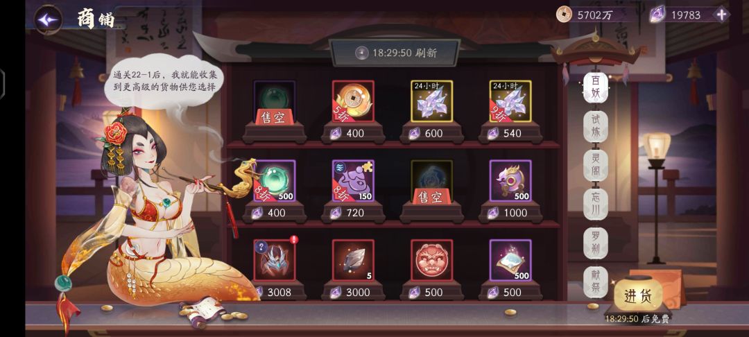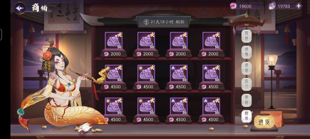 第一排第一个,随着推图进度,这个可买的数量会增加,我这个进度每天买一次花60w铜板能买500灵珏。右下角有个进货,每天可以免费刷一次,之后花钻石(妖魄),我忘了是几次100,几次200了,建议就刷到最后一个200,每天花不到1000妖魄,能买五六次...或者更多?我忘了(〇_o)