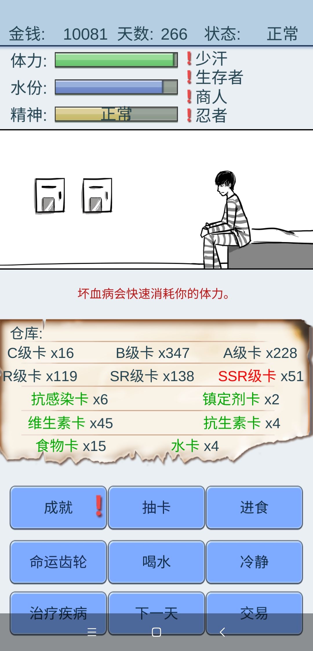 游戏中还可能有一种特别的状态:你有精神强大等四个天赋,经过几十天的积累攒了一些食品卡水卡镇定剂c,b,a,s,sr之类的卡,这天商店里水卡或食品卡什么的一张卖到60+,但买入镇定剂却比较便宜,于是精神小伙先卖掉水卡赚了几千块,把卡全抽了,有爆出了足够多的物资卡让你来卖,用少量的价钱买镇定剂回复理智,然后不停的循环一天抽够10000次卡,直接出狱(隔壁有大佬算了能出发无限抽卡的条件,是大佬awsl![[嗒啦啦2_我好菜]](https://img-tc.tapimg.com/market/images/0827e8f080b769074b9257fafe25b00d.gif)