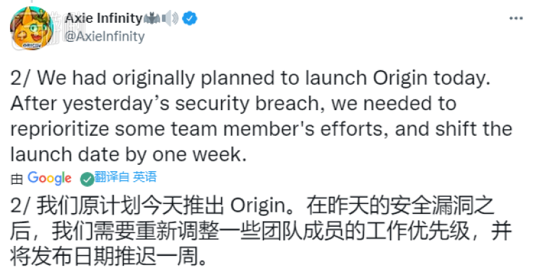 由于这场突发的意外,原定于3月31日发布的《Axie Infinity》大型版本更新宣布延期一周,与《Axie Infinity》挂钩的一大批验证节点通通关闭,多家自动做市商暂停运行,Ronin