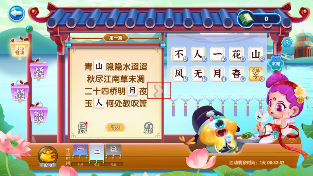 馆长们每天都会随机刷出10首诗词,馆长每填完一首点击右边箭头即可切换到下一首,填写完整诗词并提交即可以获得相应的诗集道具奖励!每当集齐任意10首诗即可获得一份集字礼袋哦~