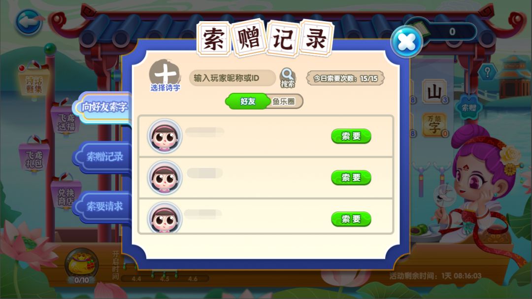 ②馆长们每天有15次机会向好友或鱼乐圈圈友请求索赠一个字,同时馆长也可以赠予出去,展示友谊的机会来啦!