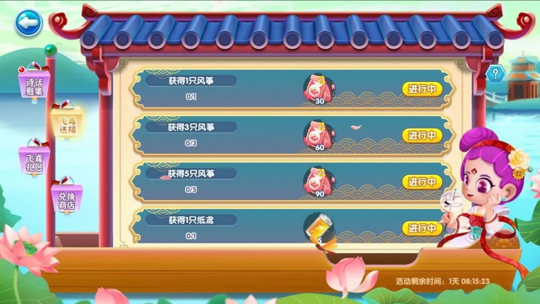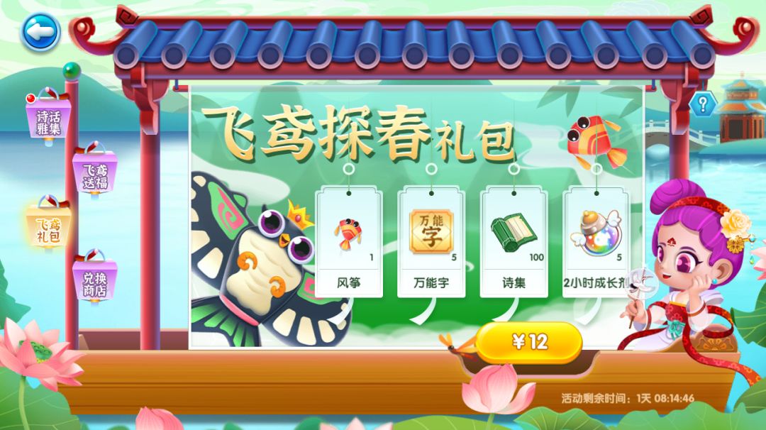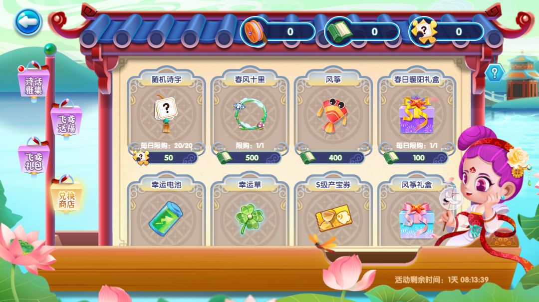 成功填写诗词后获得的诗集道具、收宝掉落的诗字碎片、风筝鱼宝,都可以前往兑换商店兑换相应奖品哦!