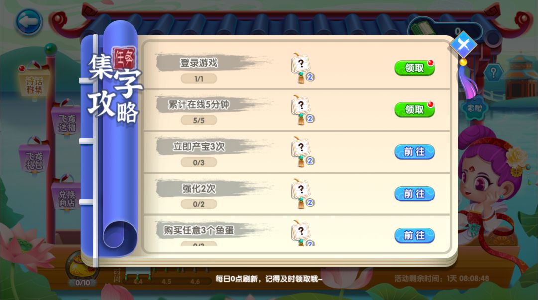 ④完成“集字攻略”每日活动任务也能获得随机字,馆长多劳多得哦!
