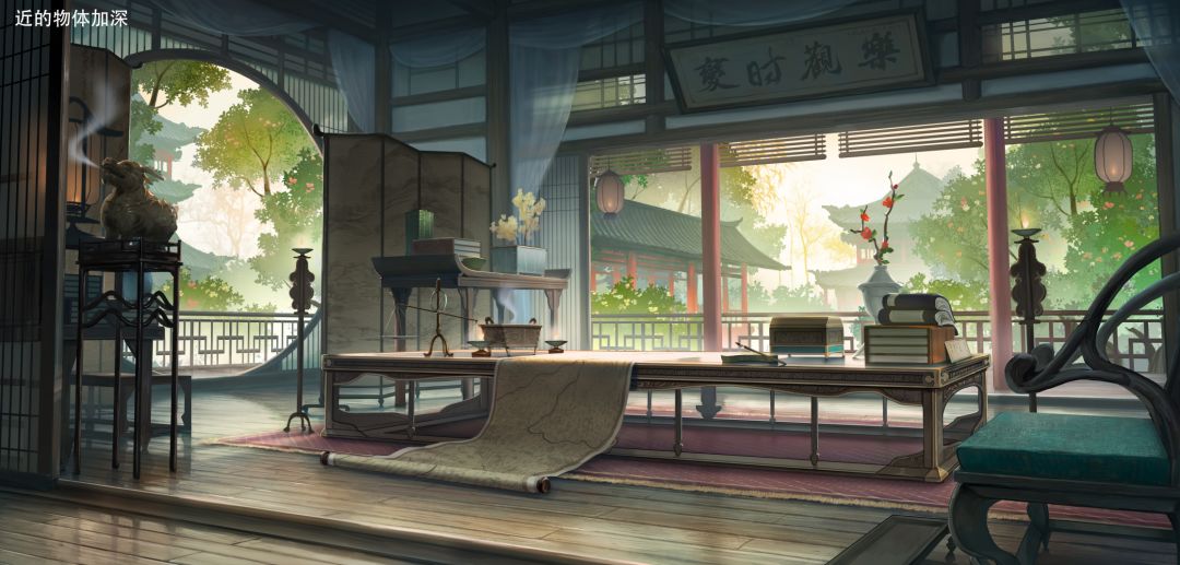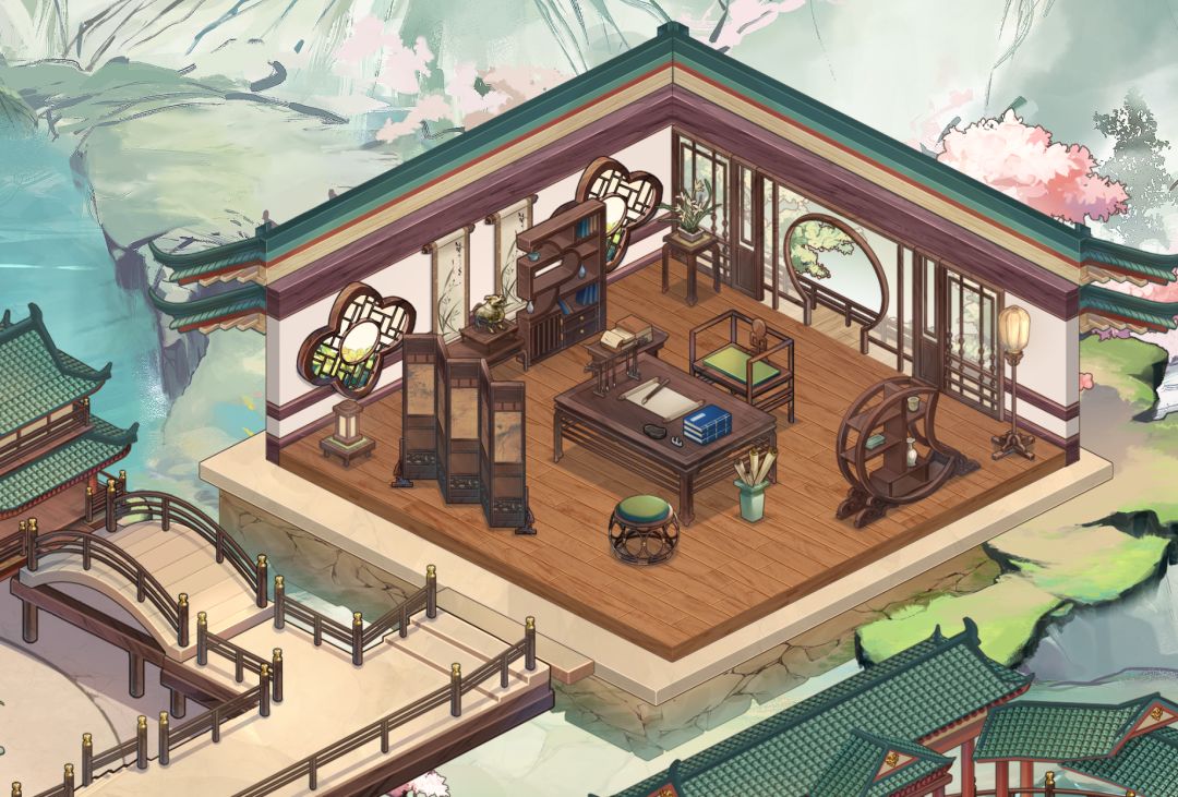 展示一个主角写《云京忆梦》的书房,设定上是回忆录,类似东京梦华录,算倒叙吧。后续会做小人在里面走,家具搜集什么的,很常见的设计了。