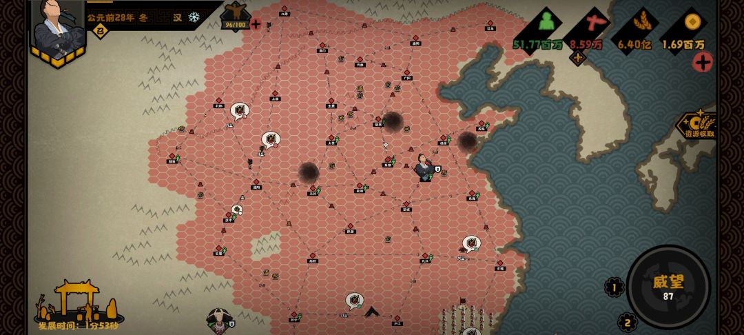 而在版图方面,这个朝代相比于其他朝代变得更大了一些,诸如辽东,南越,夜郎等都出现在版图上,不过需要注意的是,地图上的匈奴是不可选的。