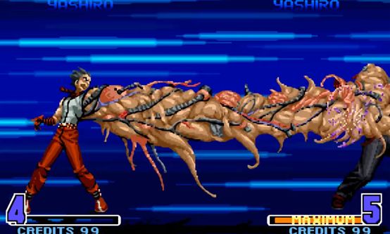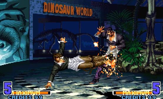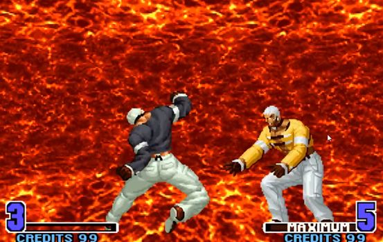 举个例子,原本在KOF2002里拥有最强一拳的七枷社,放在该作里直接成了超越BOSS的存在。压起身、无视防御、超大个积分为、迅速的释放速度……几乎所有有点都集合在了七枷社的这一“末日之审判”上,当时可以说只要选出了七枷社,在这个游戏里就可以拥有一串三的实力,连续不断的熔岩背景也看得人热血沸腾。
